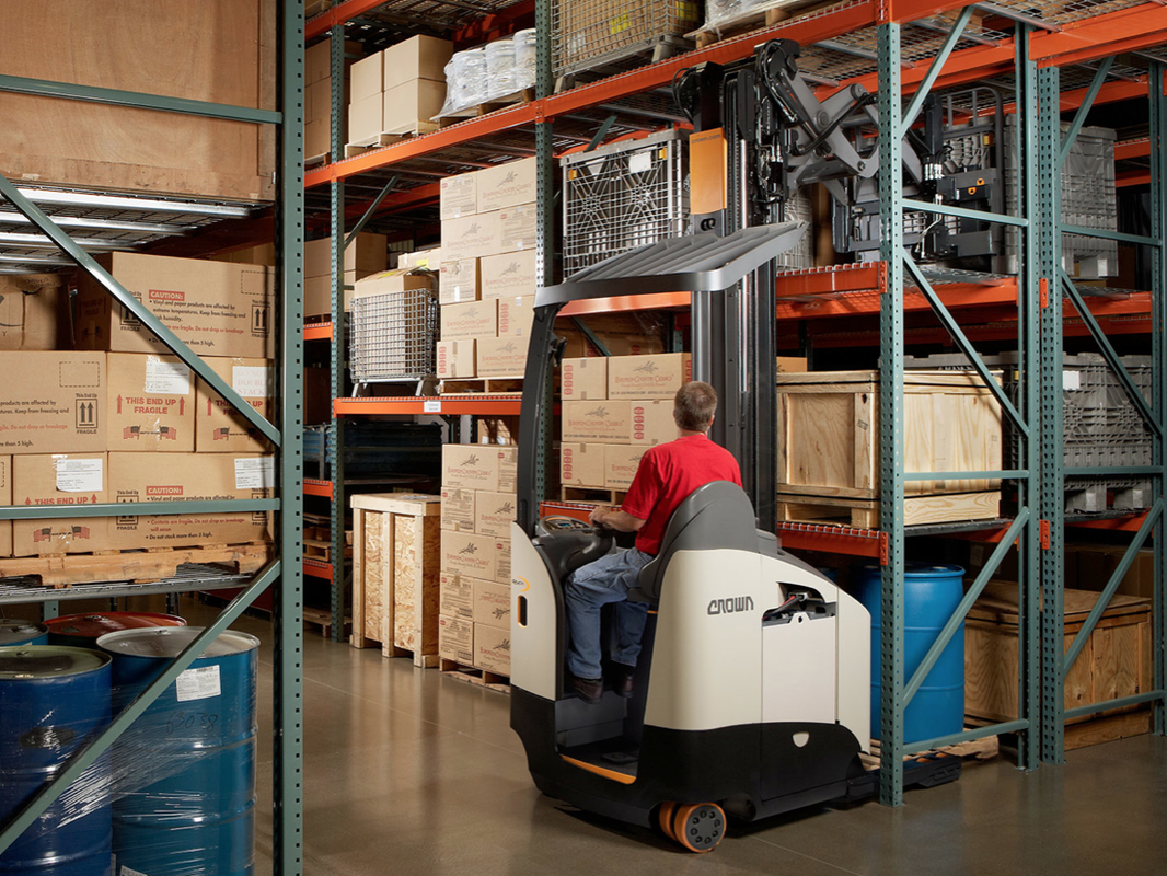 普通高舉升叉車即可,與滾筒式軌道搭配:叉車將貨物搬運至貨架高的一端,貨物利用自重滑下存儲。