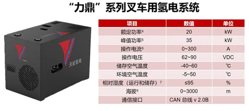 此次天能氫能源與徐工特機合作打造的適用于叉車專用的“力鼎”燃料電池系統(tǒng),額定輸出20kW,峰值輸出可達35kW,燃料電池電堆設(shè)計壽命可達10000h,兼容市面上大部分鉛酸或鋰電電動叉車。產(chǎn)品在徐工叉車上進行配置應(yīng)用后呈現(xiàn)“體積小,零碳排,加氫3分鐘、工作5小時”的特點,有效解決了新能源叉車產(chǎn)品的續(xù)航問題。